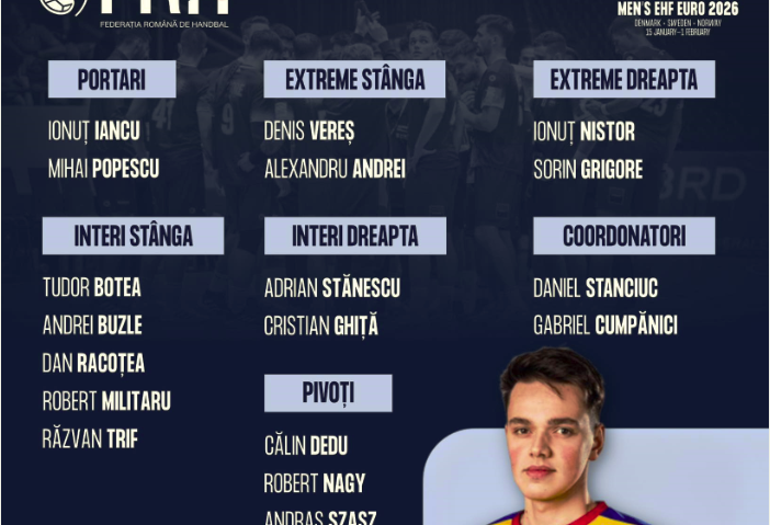 România participă la Campionatul European masculin de handbal din 2026, găzduit de Danemarca, Suedia și Norvegia între 15 ianuarie și 1 februarie. Tricolorii se află în grupa B, cu Danemarca, Portugalia și Macedonia de Nord, și vor debuta pe 16 ianuarie la Herning, arată %source%.